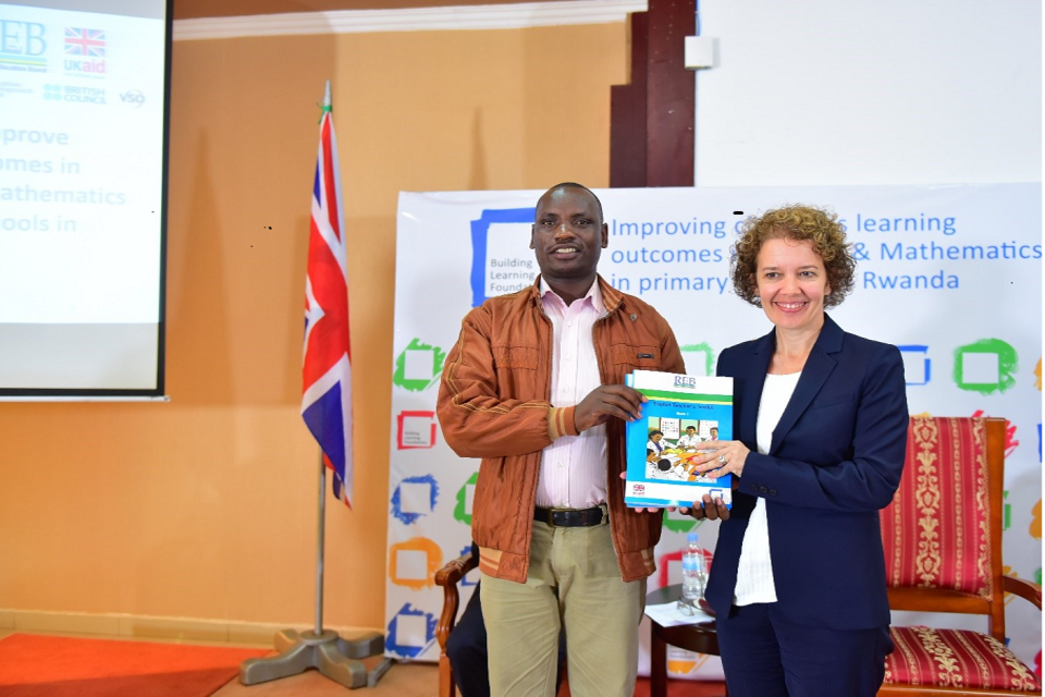 Jo Lomas, British High Commissioner to Rwanda, presents an English toolkit to the head teacher of Kagugu Primary school at the BLF launch.