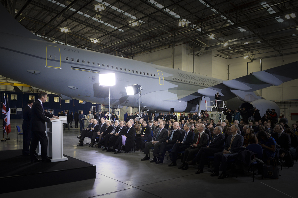 Here in the shadow of this great aircraft which in many ways sums up Anglo-French cooperation. An A330: the body made in Toulouse, the wings made in Wales, the landing gear made in Bristol, and the Rolls-Royce engines made in Derby. And so a very warm welcome, Francois, to RAF Brize Norton this morning.