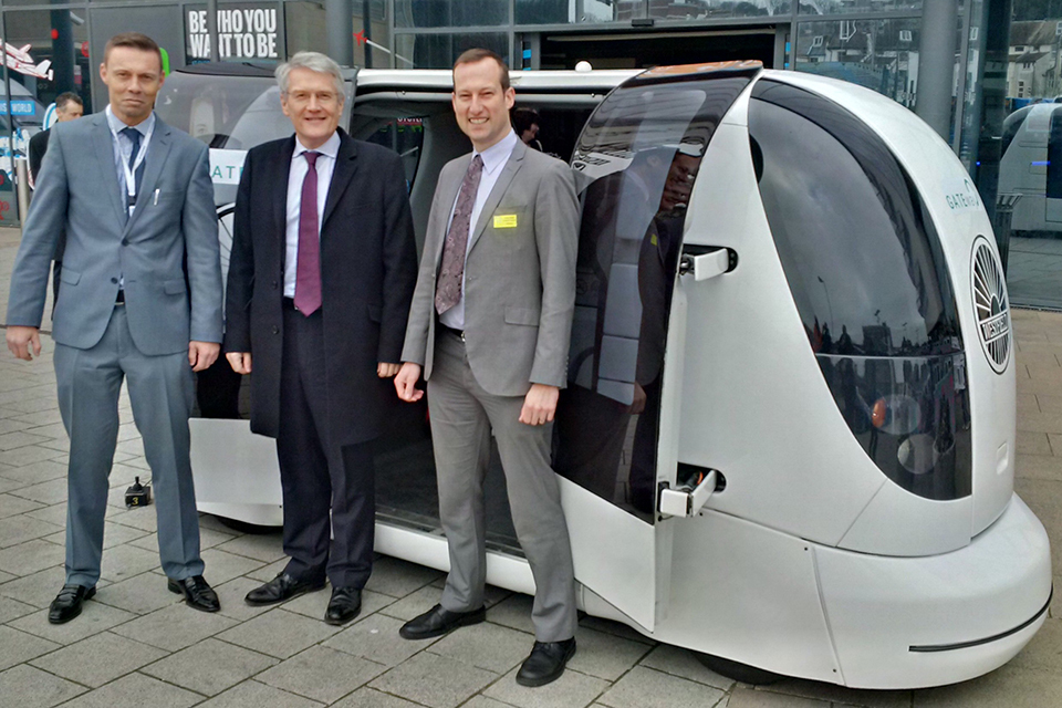 Transport Minister Andrew Jones and a driverless car.