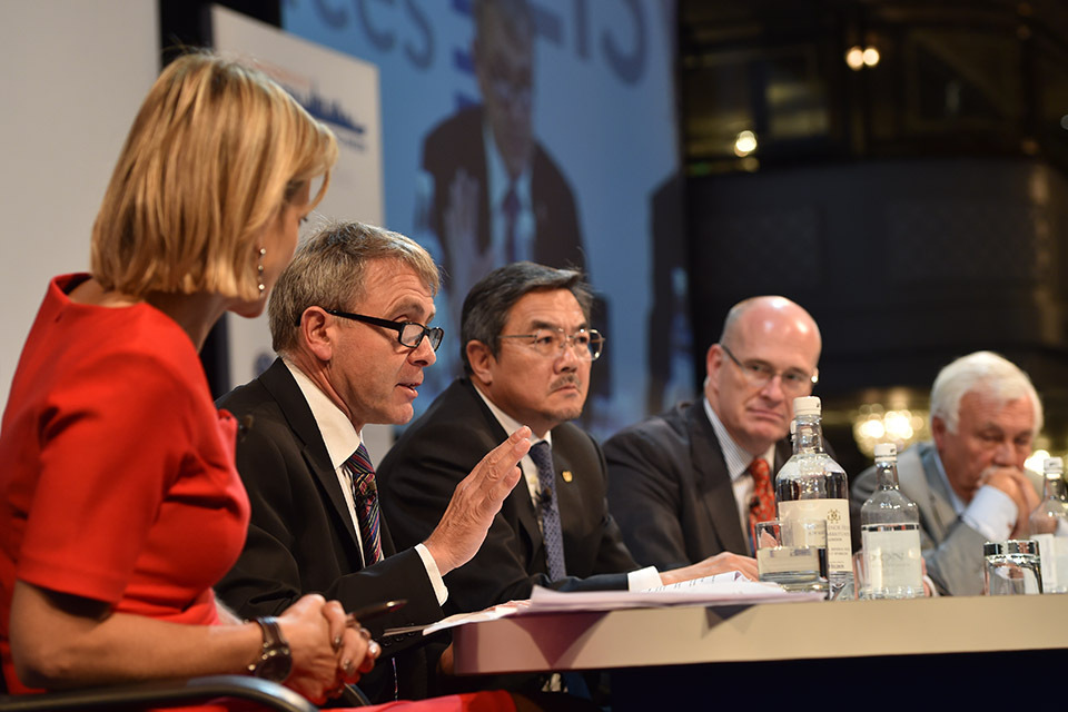 Emily Maitlis, Robert Goodwill, Koji Sekimizu, Paul “Chip” Jaenichen and Fotis Karamitsos in discussion at the London International Shipping Week 2015 Conference.