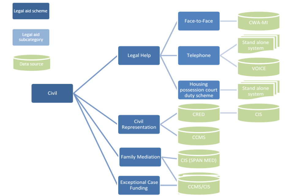 These can be categorised by the areas of law that are within the scope of civil legal aid. For example, legal aid may be available for issues involving a child being taken into care, assistance with asylum claims, housing issues (where there is a risk of serious disrepair or homelessness), family mediation, or help and advice if you are a victim of domestic violence. Descriptions of the main categories are given under ‘civil’ in the glossary of this user guide. Civil legal aid can also be categorised by type of legal service: