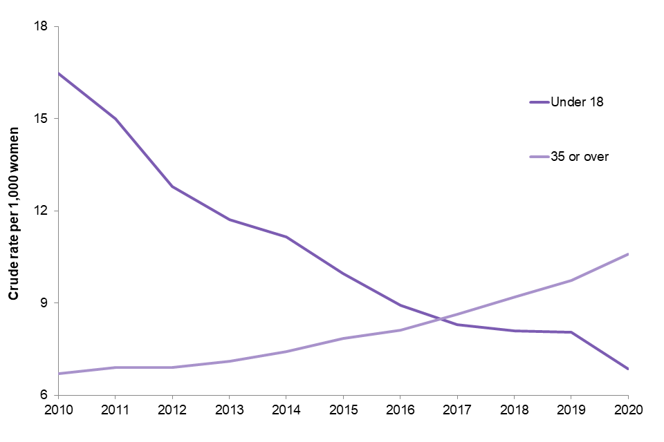 The abortion rate for women aged under 18 has decreased compared to 2019 (from 8.1 to 6.9 per 1,000 between 2019 and 2020) but has increased for women over 35 (from 9.7 to 10.6 per 1,000 between 2019 and 2020).