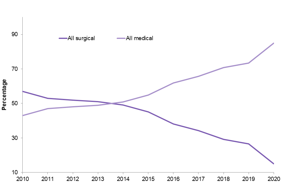 85% of abortions were medically induced; which increased from 73% in 2019, and increasing by 42 percentage points since 2010.
