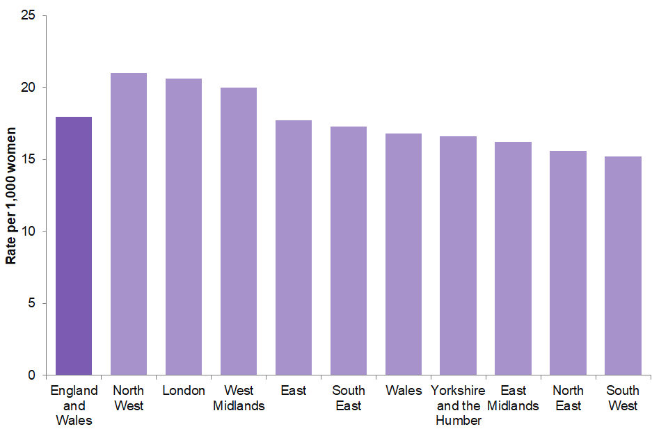By region of residence, rates of abortion are highest in the North West (21.0 per 1,000 women aged 15 to 44) and lowest in the South West (15.2 per 1,000 women aged 15 to 44). (Figure 8).