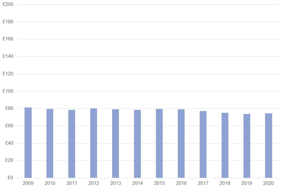 Jobseeker’s Allowance rates for a single person since 2009 expressed in April 2020 prices