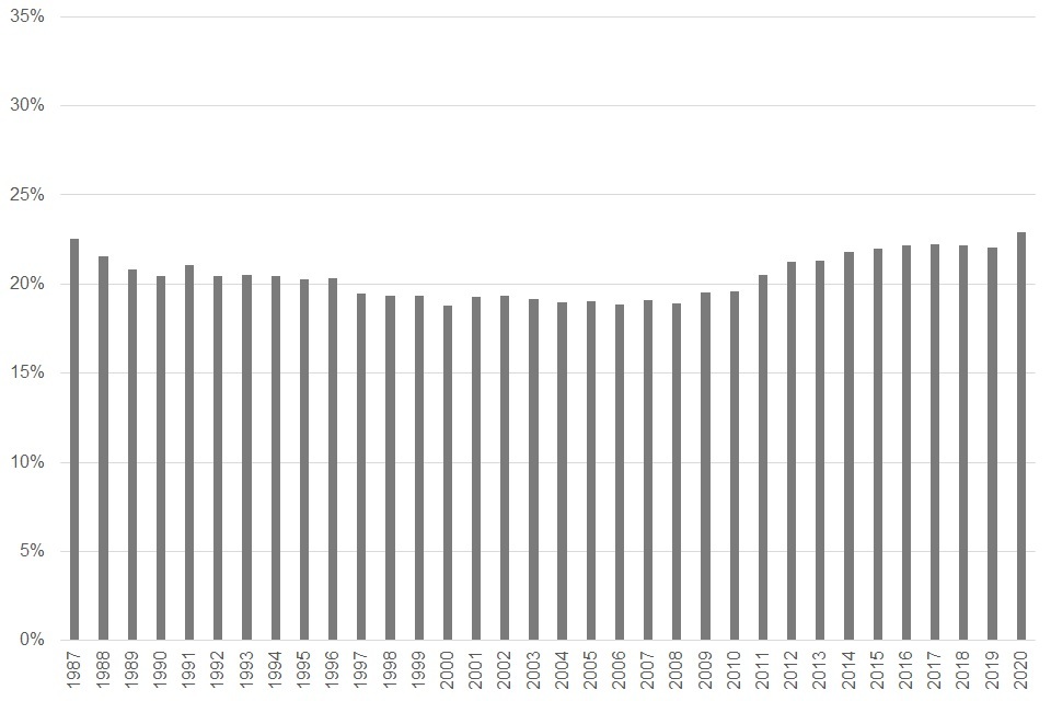 Basic State Pension for a single person expressed as a ratio relative to median earnings since 1987