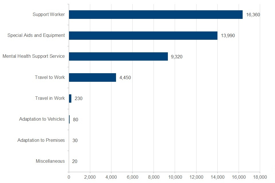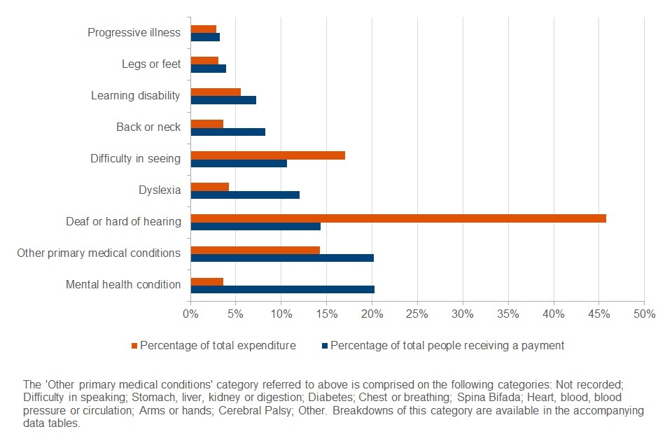 - those who are ‘Deaf and hard of hearing’ are in receipt of the highest proportion (46%) of total Access to Work expenditure
