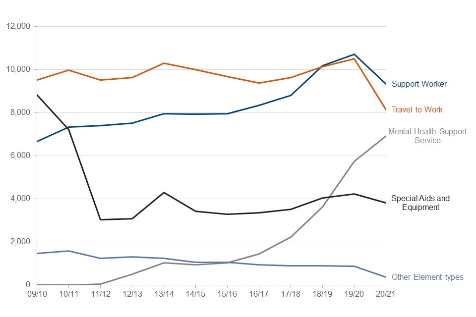 Number of people who received a payment for any Access to Work Element of each type, 2009 to 2021