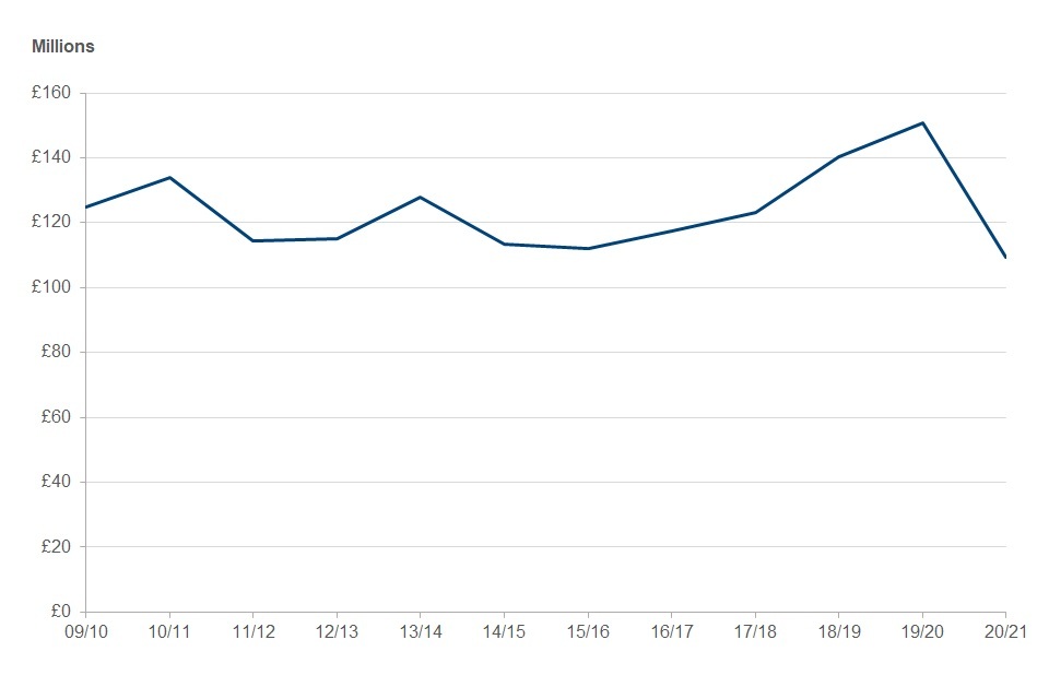 Expenditure on Access to Work provision 2009 to 2021 in millions (Nominal terms)