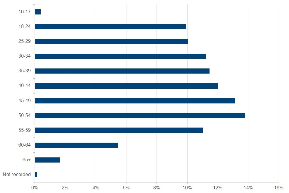 - the largest Access to Work customer group in terms of number of payments, by age are those aged 45 to 54 who account for 27% of the total number of customers