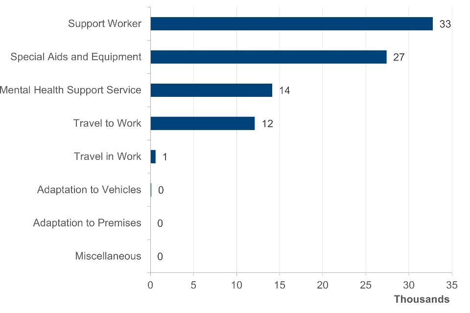 The expenditure data in these statistics covers Department for Work and Pensions (DWP) expenditure only. In many cases, the employer will be asked to contribute to the cost of provision under “cost share” arrangements. The employer element of expenditure is not included in these statistics. This data is used to calculate statistics on the number of people in receipt of Access to Work payments in each year.