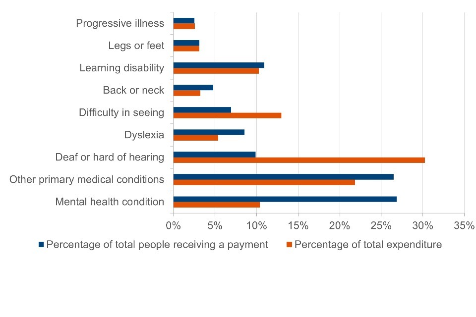 Percentage of total expenditure and percentage in receipt of payment in 2023 to 2024 by primary medical condition