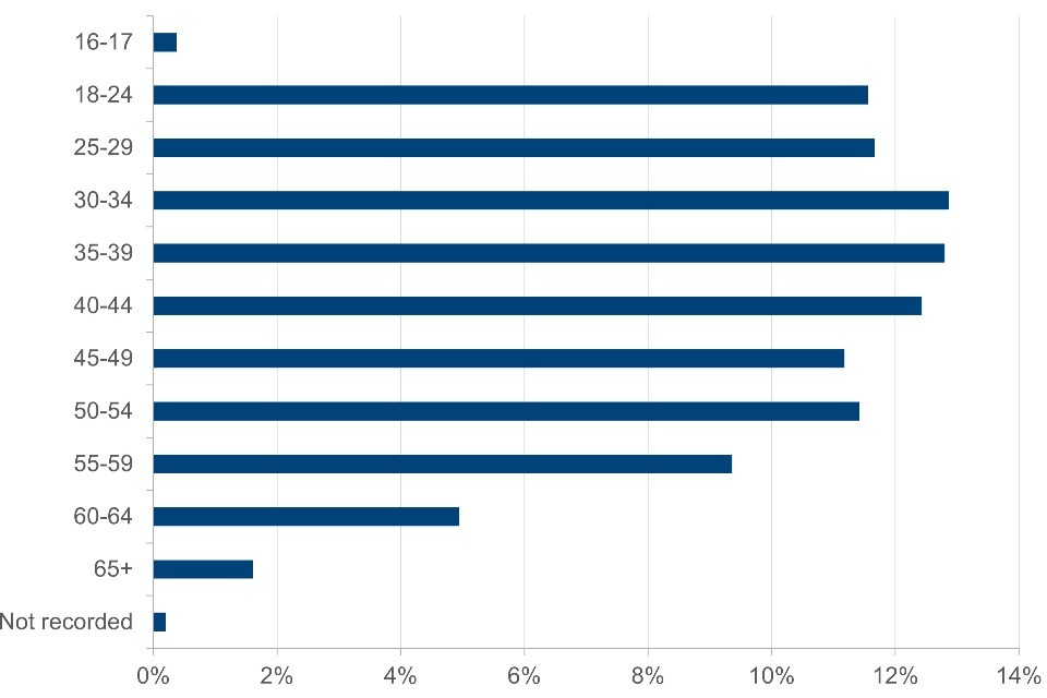 - the largest Access to Work customer group in terms of number of payments, by age are those aged 30 to 34 however the age distribution is mostly uniform across age bands 18 to 54