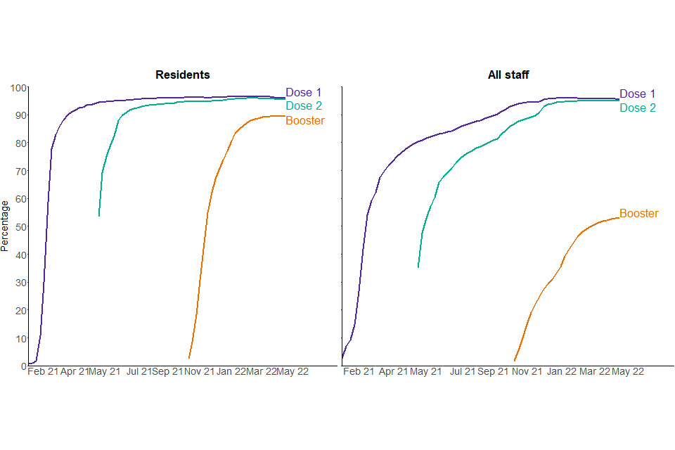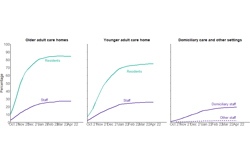 99.4% of older adult care homes have provided data on the number of staff and residents who received a first COVID-19 booster dose, as of week ending 22 March 2022. This means the first and second dose rates, and the number of staff and residents receiving a first booster dose may be underestimated compared with the true value.