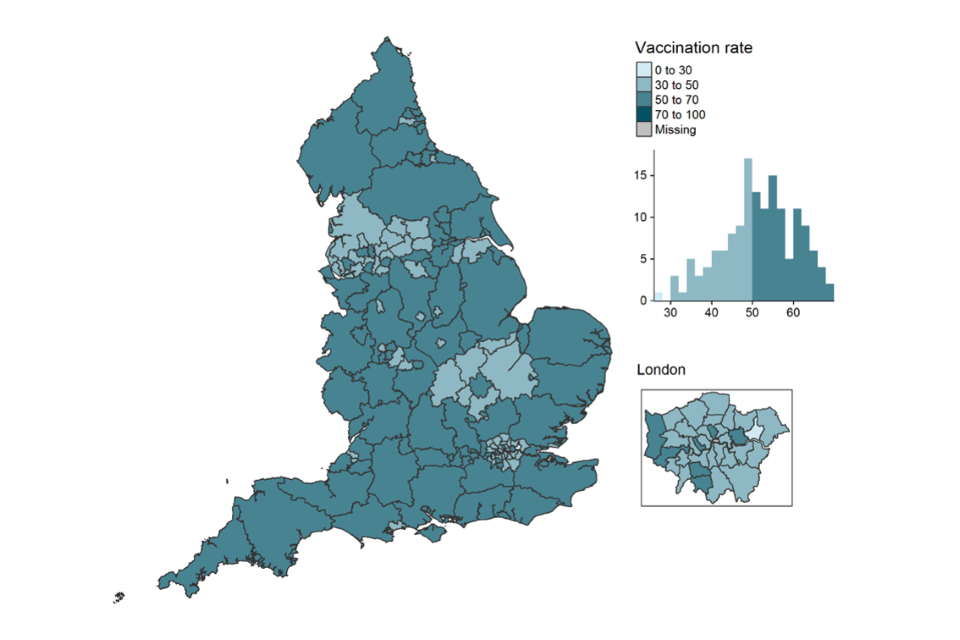 comparing vaccination rates across local authorities and regions in England as self-reported by care providers for the: