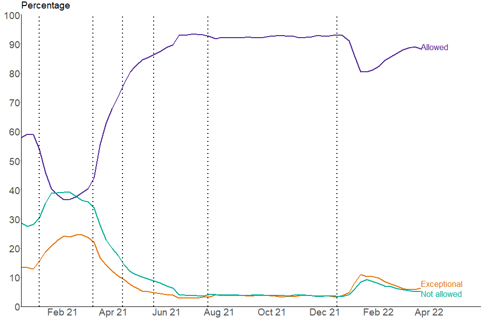 - 88.3% of care homes in England were able to accommodate residents receiving visitors. This was a slight decrease compared to the previous week, following a period of substantial increase from the end of January 2022 through to mid-March 2022