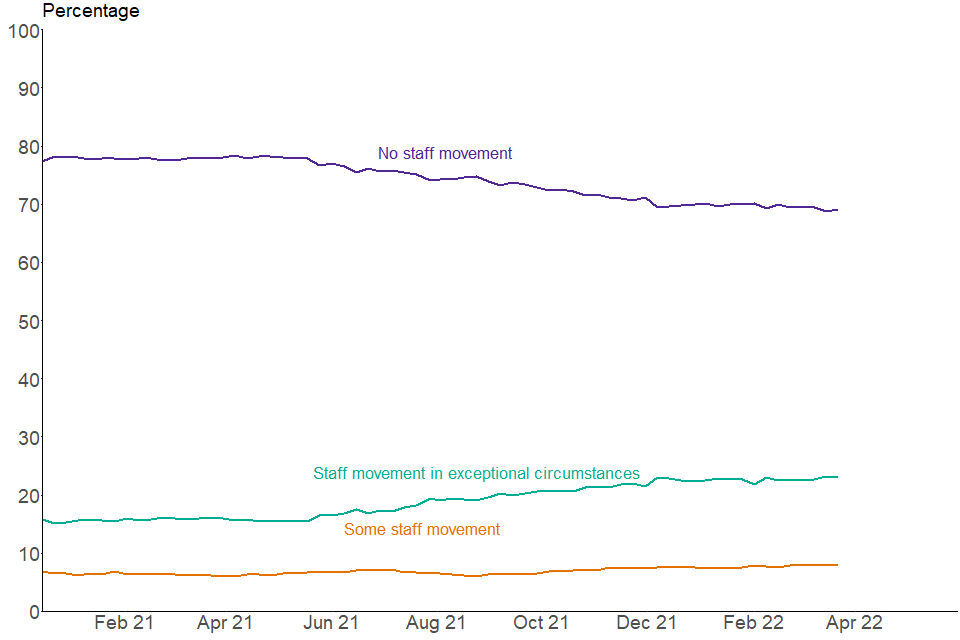 - 69.0% of care homes had no staff members working in another health or social care setting. This proportion has been stable since the end of November 2021, after a period of gradual decline from April 2021