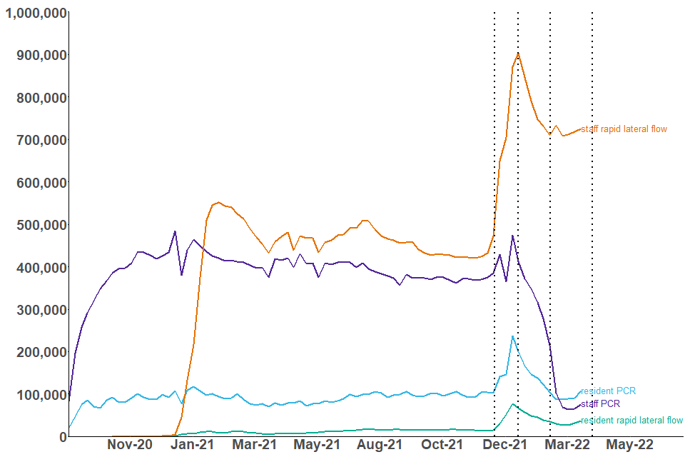 The number of tests conducted among staff and residents has increased slightly throughout March 2022 for both rapid lateral flows and PCR tests, following a period of rapid decrease.
