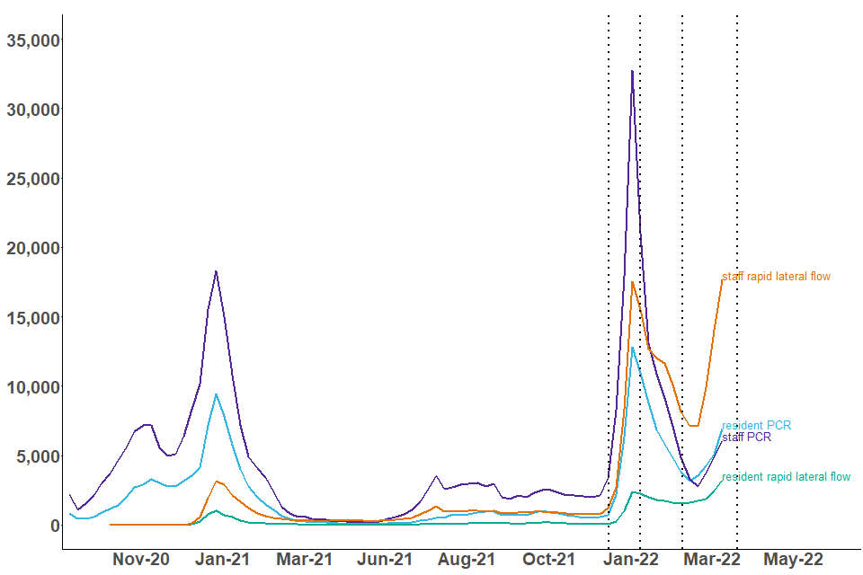 The number of positive test results returned in care home staff and residents rapidly increased throughout March 2022.