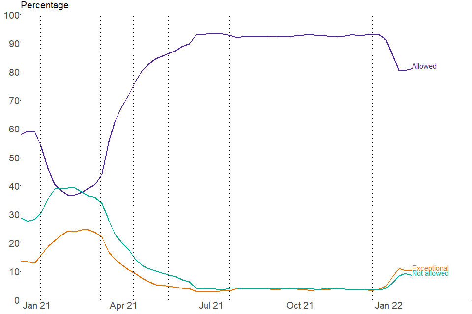 - 81.1% of care homes in England were able to accommodate residents receiving visitors. This has recently stabilised after a substantial decrease at the end of December 2021
