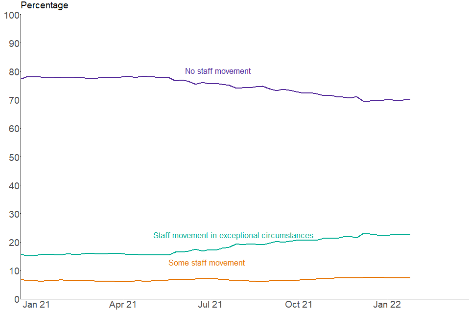 - 69.9% of care homes had no staff members working in another health or social care setting. This proportion has been stable since the end of November 2021, after a period of gradual decline from April 2021