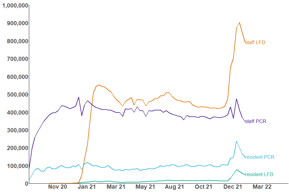 - the overall number of tests conducted in care homes among staff and residents has started to decrease, after reaching record numbers in early January 2022
