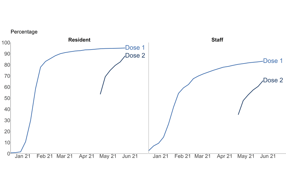 95.1% of residents and 83.2% of older adult care home staff have received their first dose as of 25 May 2021. The proportion rapidly increased between January and February 2021 and has since continued to increase but at a slower pace as more of the population receive the vaccine.