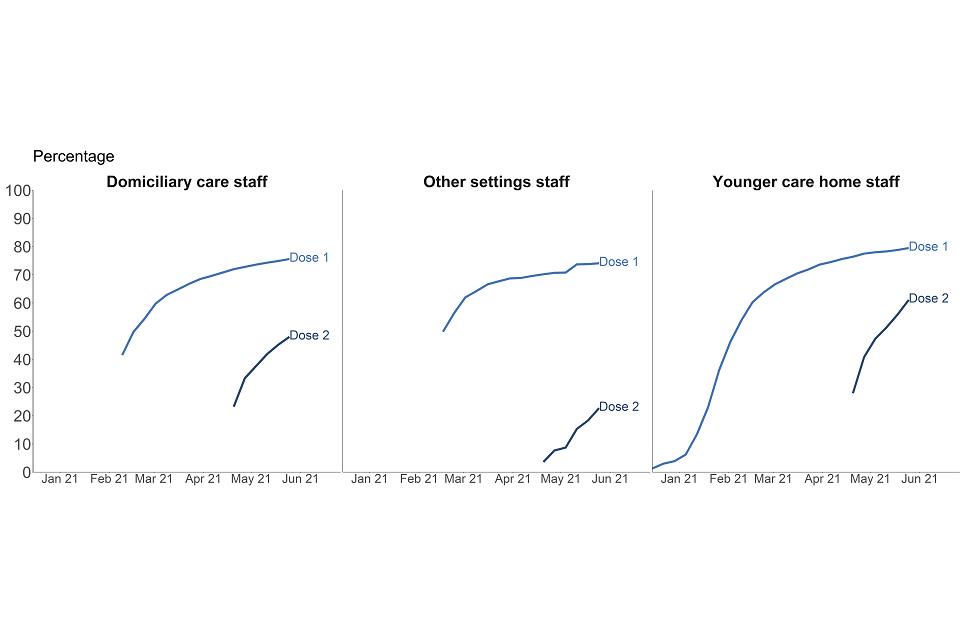 61.1% of younger adult care home staff have received their second dose as 25 May. There is a substantial difference between staff directly employed by care homes and agency staff; 62.7% and 32.8% of staff received the second dose, respectively.