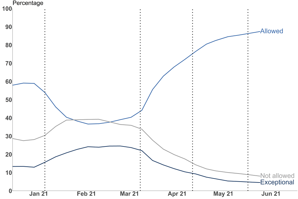 87.4% of care homes in England were able to accommodate residents receiving visitors within care homes, compared to 40.3% at the beginning of March 2021