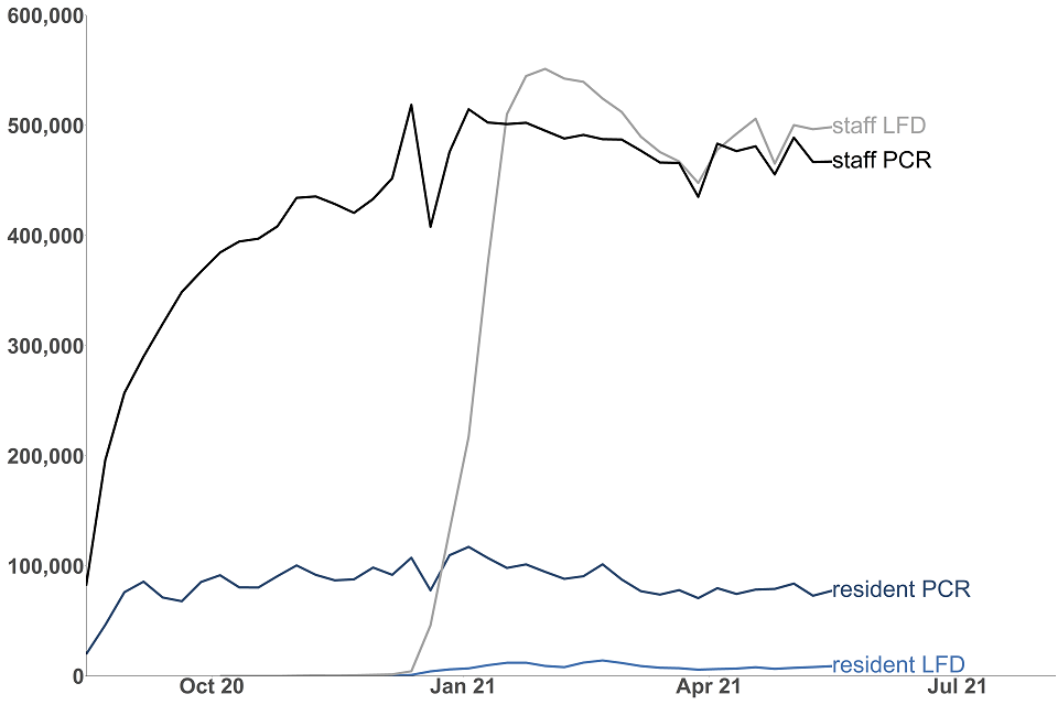 differences in which tests from different routes are included. Both methodologies include the number of tests registered from kits sent directly to care homes, but this publication additionally includes care home staff or residents tested via other routes such as regional or local test sites. As a result, figures in this report will be substantially higher for PCR tests conducted in care home staff due to the current guidance recommending staff with symptoms to be tested outside of the care home (see coronavirus (COVID-19) testing in adult care homes for more information)