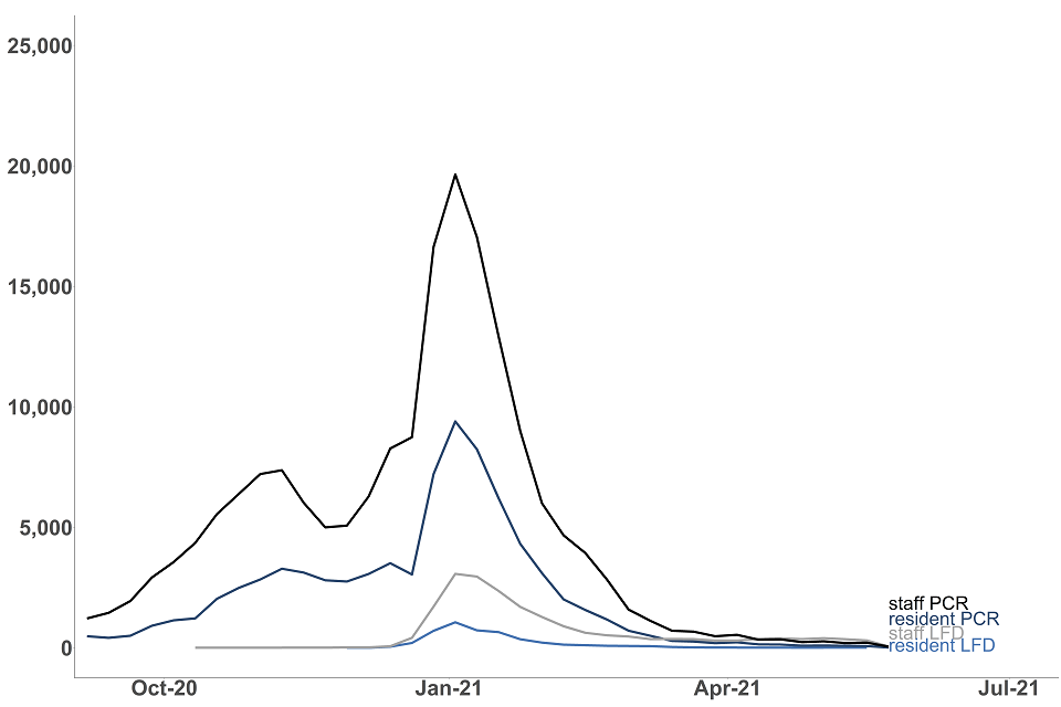 The number of positive test results returned from PCR kits in care home staff steeply increased from 2,202 tests in the week ending 8 September 2020 to 19,522 in the week ending 12 January 2021. Thereafter the number of positive test results from PCR kits has overall fallen sharply with 230 returned in the week ending 25 May 2021.