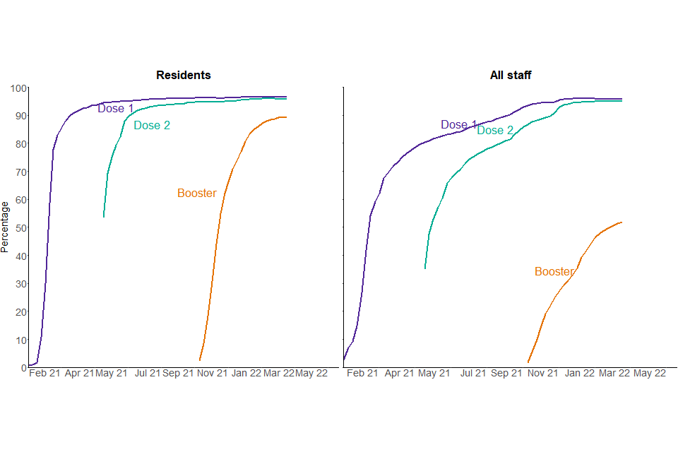 Data on total number of staff and residents as well as those vaccinated is self-reported by care providers and local authorities. Providers are expected to update their vaccination data on a daily basis. There may be a time lag between individuals receiving the vaccine and the week they are reported in the statistics depending on when providers have updated their vaccination data.