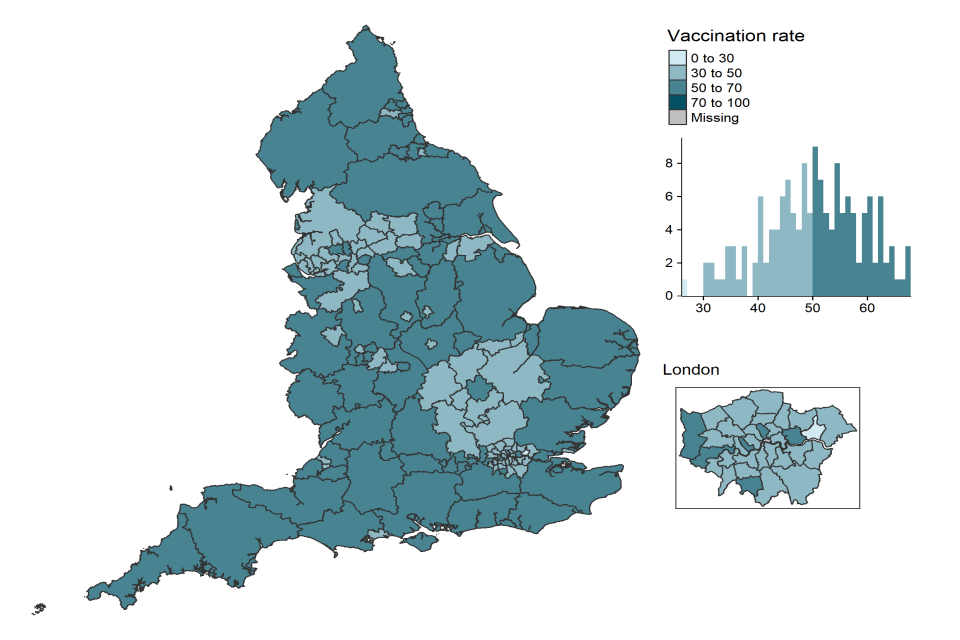 comparing vaccination rates across local authorities and regions in England as self-reported by care providers for the: