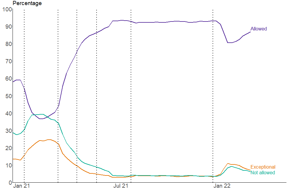 From 11 November 2021, all people working or volunteering in care homes were required to be fully vaccinated against COVID-19, unless exempt. Regulations extending this requirement to health and wider social care were also set to come into force on 1 April 2022. As Omicron, which is intrinsically less severe, replaced Delta as the dominant variant, DHSC consulted on revoking this requirement. Over 90,000 responses were received and 90% supported the removal of vaccination as a condition of deployment.