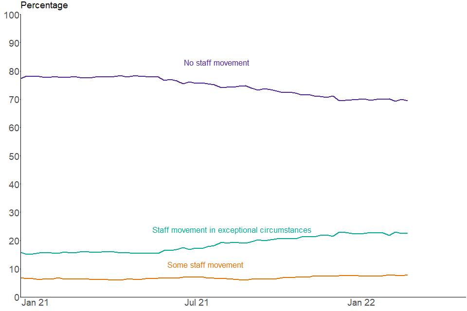 - 69.4% of care homes had no staff members working in another health or social care setting. This proportion has been stable since the end of November 2021, after a period of gradual decline from April 2021