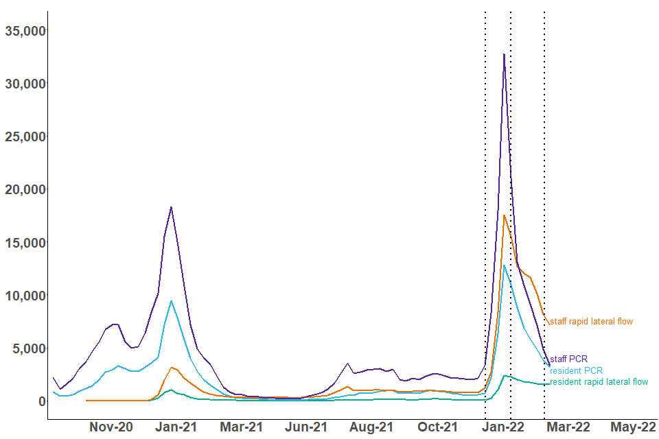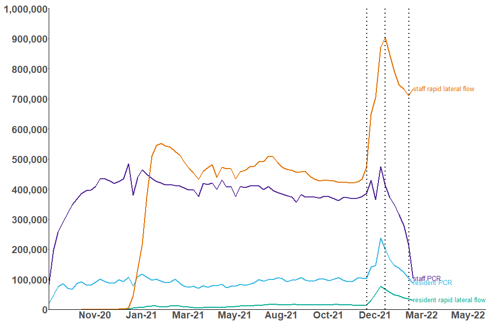 Since the end of January 2022, the overall number of PCR tests conducted in care homes among staff and residents has decreased substantially, as a result of recent changes to testing guidance in care homes.