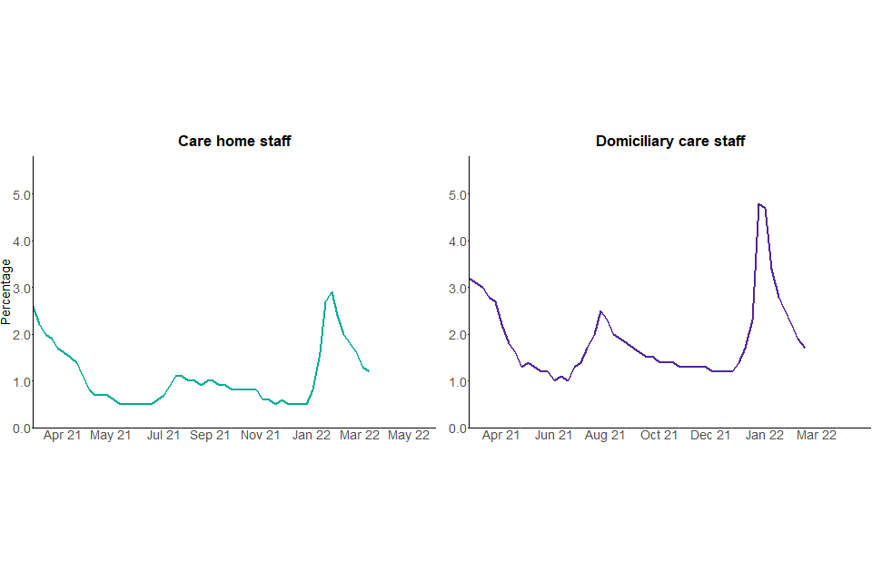 - 1.2% of care homes staff and 1.7% of domiciliary care staff were absent due to COVID-19 related reasons