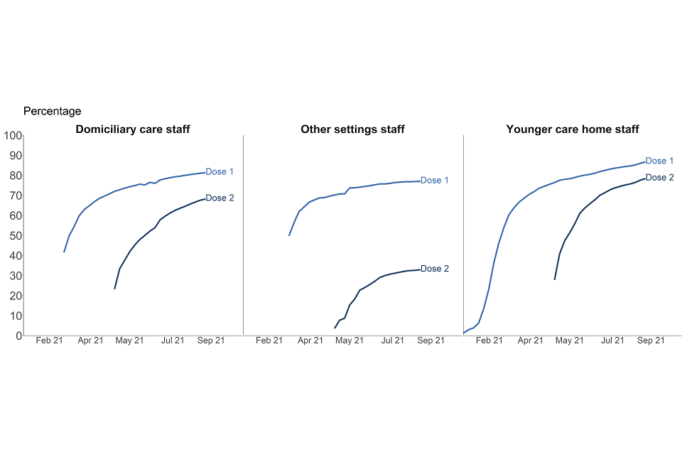 81.3% of domiciliary care staff have received their first dose and 68.2% their second dose as of 24 August 2021. Among staff working in other settings, 77.0% settings have been reported to have received their first dose and 32.9% their second dose as of 17 August 2021.