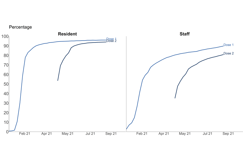 Since data on the second dose became available on 20 April 2021 the reported vaccination rate increased steeply until the end of June. Thereafter uptake has continued to increase but at a slower pace as more staff and residents receive the second dose.