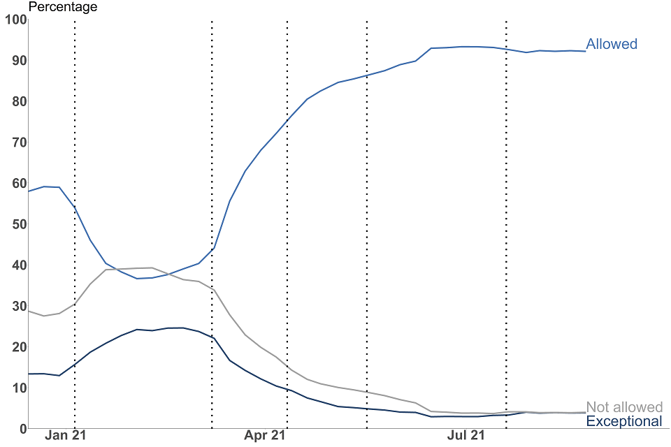 92.1% of care homes in England were able to accommodate residents receiving visitors, compared to 40.3% at the beginning of March 2021
