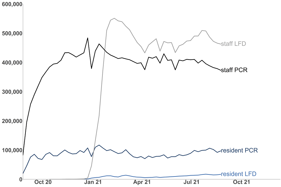 there were 372,774 polymerase chain reaction (PCR) tests and 462,727 lateral flow device (LFD) tests taken by care home staff. There were 3,049 positive results returned from PCR tests and 1,059 returned from LFD tests
