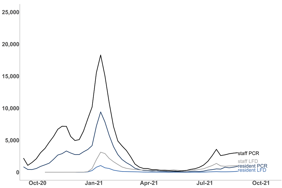 for both care home staff and residents, there has been an increase in the number of positive tests returned in PCR and LFD kits compared to mid-May. There was a decrease in the number of positive tests at the end of July but this has since begun to gradually increase again up to the end of August