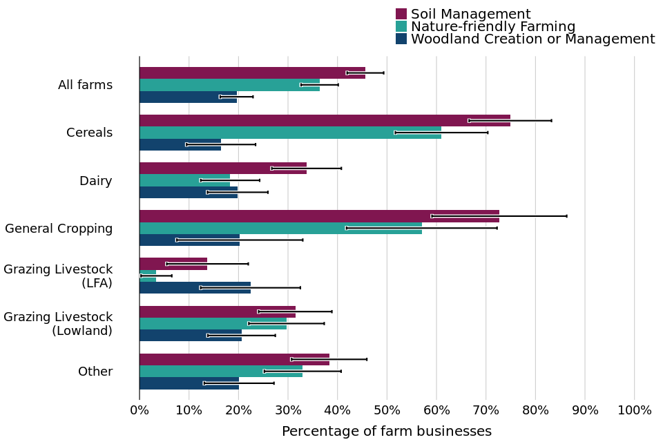 - Regardless of whether or not the land was registered in a scheme, the most popular agri-environment categories were soil management (46% of farm businesses), nature-friendly farming (36%) and woodland creation or management (20%).