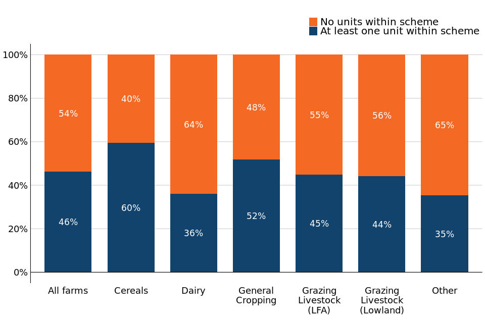 This data was collected as part of the Farm Business Survey (FBS), therefore, the estimates presented here are only representative of the farm businesses with a standard output of at least 25,000 euros. They should not be used as official scheme uptake figures for Defra’s agri-environmental schemes. Official statistics on SFI action uptake can be found at the following page: https://www.gov.uk/government/statistics/cs-es-and-sfi-option-uptake-data-2024. The results cover the average period 1 March 2022 to 28 February 2023, including the 2022 harvest, 2022 Basic Payment and the second year of the agricultural transition period.