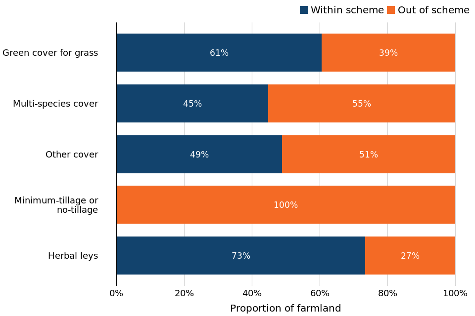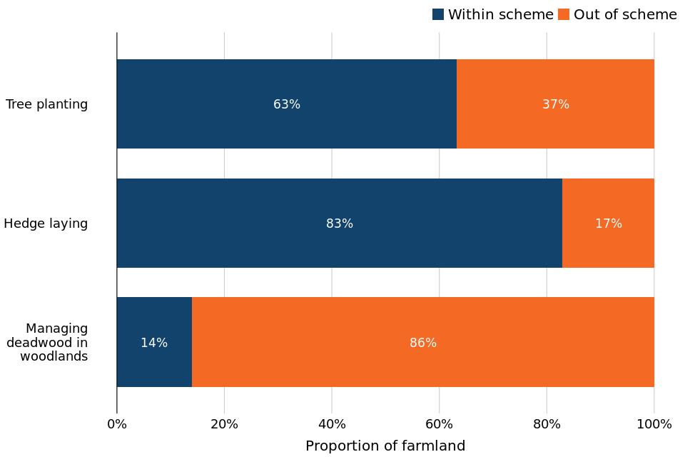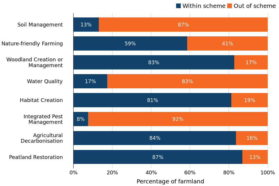 The opposite was the case for soil management, water quality and integrated pest management. Of the farmland doing these activities, less than 20% was within scheme for each category.
