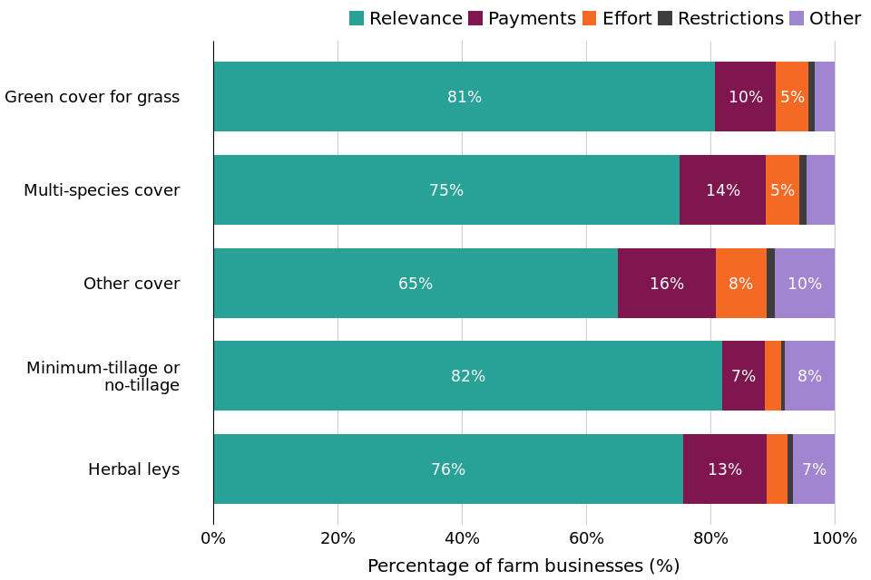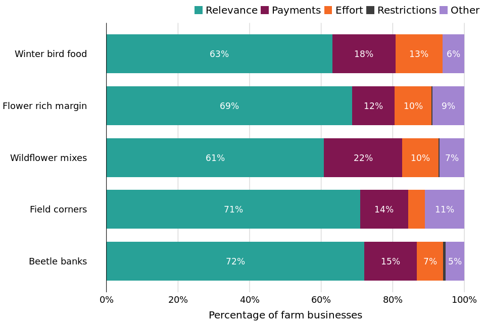 Across all agri-environment activity categories, the primary reason for farms not undertaking agri-environment activities was because the activity was not relevant or would disrupt their existing farming systems. The response was grouped this way within the survey; therefore, further breakdown of this group is not possible. For all categories except for integrated pest management, insufficient payment was the second most common reason for not undertaking an agri-environment activity.