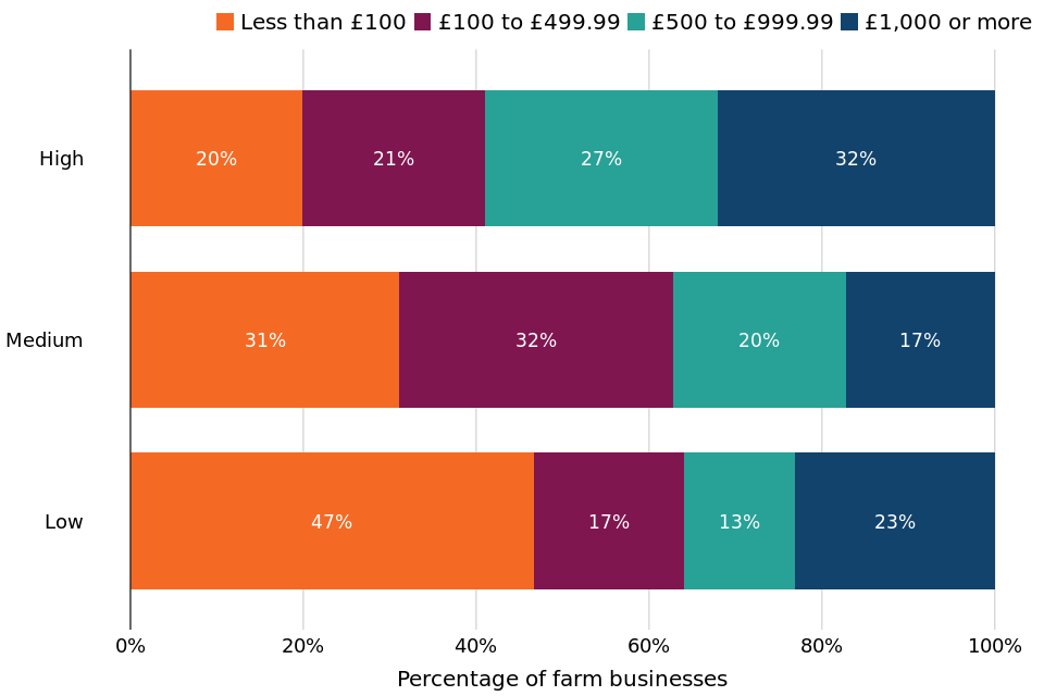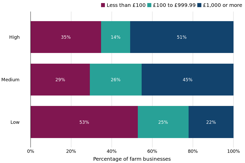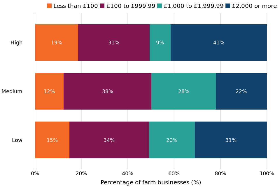 For the Farm Business Survey, the confidence intervals shown are appropriate for comparing groups within the same year only; they should not be used for comparing with previous years, since they do not allow for the fact that many of the same farms will have contributed to the Farm Business Survey in multiple years. Confidence intervals only give an indication of the sampling error; they do not reflect any other sources of survey errors, such as non-response bias.