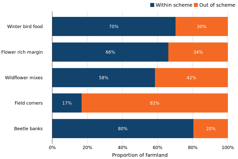 Farmland that is registered in an agri-environment scheme generates payments from Defra in return for performing certain tasks. Specific rules must be followed, such as when to plant and harvest crops. In this publication, this farmland is referred to as ‘within scheme’. Farmland that is not in a scheme does not generate agri-environment payments from Defra. However, farmers may still choose to carry out agri-environment activities independently and can decide how to manage their land; this farmland is referred to as ‘out of scheme’. The FBS collects data on both out of scheme and within scheme agri-environment activities; the main categories collected in the FBS are: