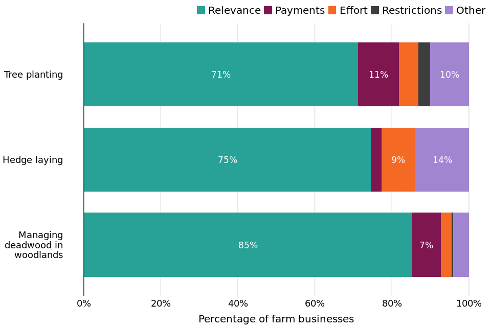 Farms that did not undertake any agri-environment activities were asked to provide the leading reason as to why they did not. Farms that did undertake at least one activity within an agri-environment category were asked why they did not for each activity within the category that they did not engage in.