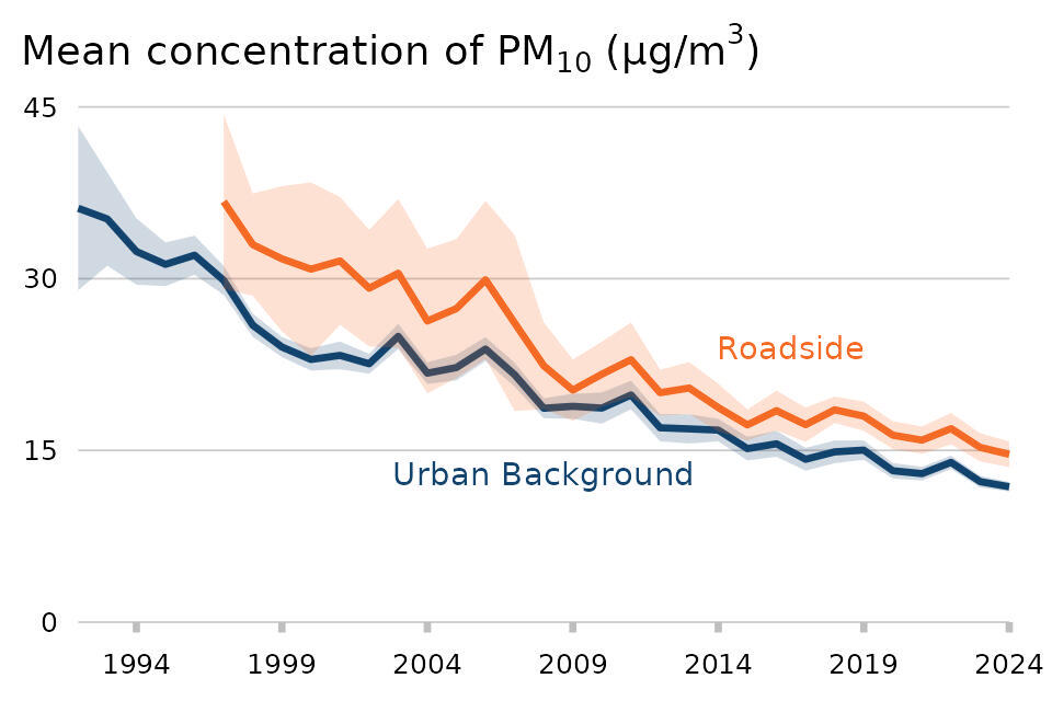 Urban background PM10 pollution has reduced in the long-term despite periods of little change in 2000-2006 and 2015-2019. There has been an overall decrease in annual mean concentrations of PM10 at urban background sites from 36.1 µg/m3 in 1992 to 11.8 µg/m3 in 2024, the lowest recorded.